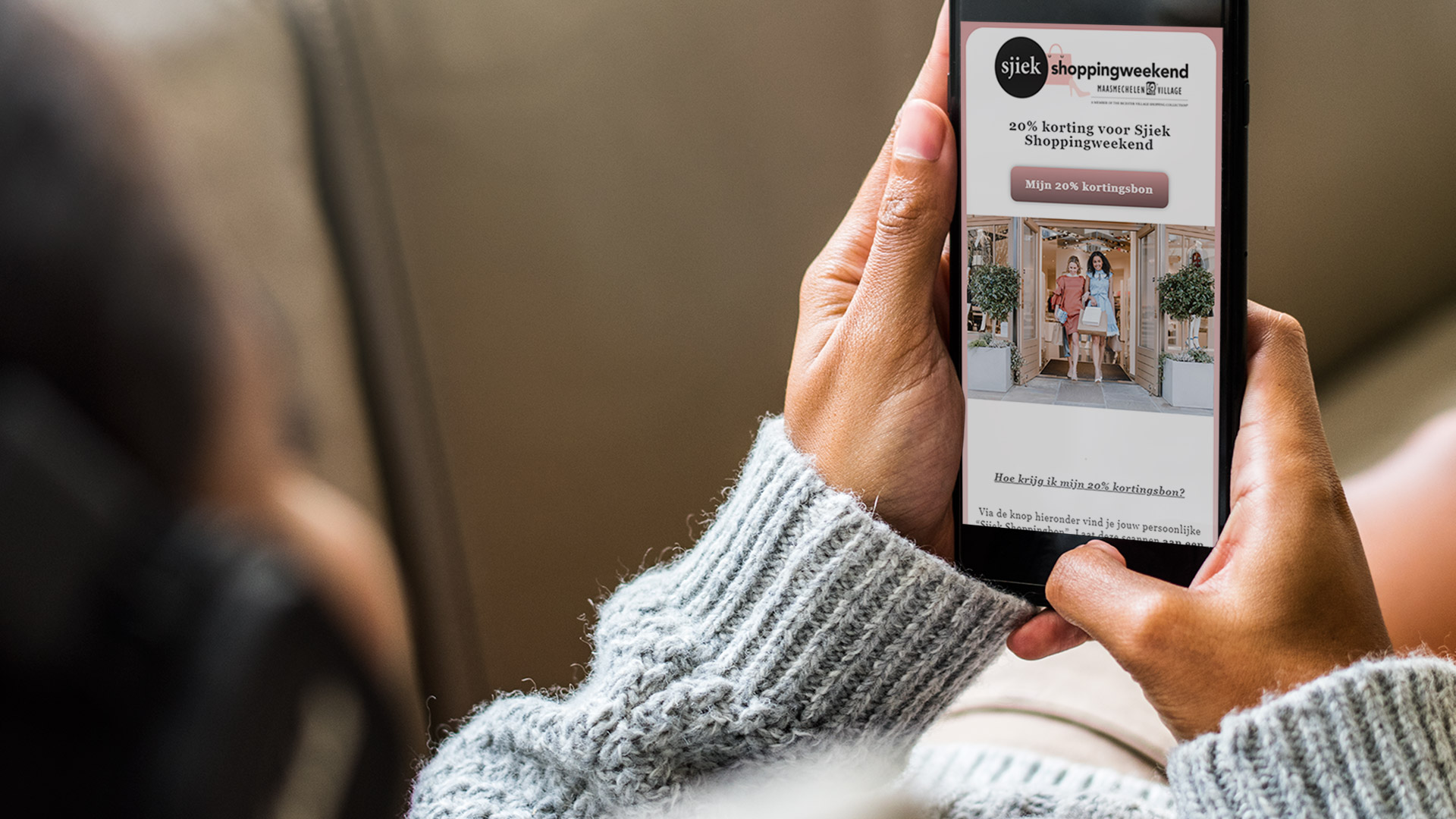Dans le cadre de cette campagne de week-end shopping par Het Belang van Limburg, les abonnés à l'application mobile de la marque de journaux ont reçu un coupon de réduction de 20 %. Cette réduction était applicable à Maasmechelen Village, un centre d'achat. Dans le but d'attirer davantage de clients à Maasmechelen Village, le journal a également étendu ce coupon de réduction de 20 % aux abonnés physiques du journal.