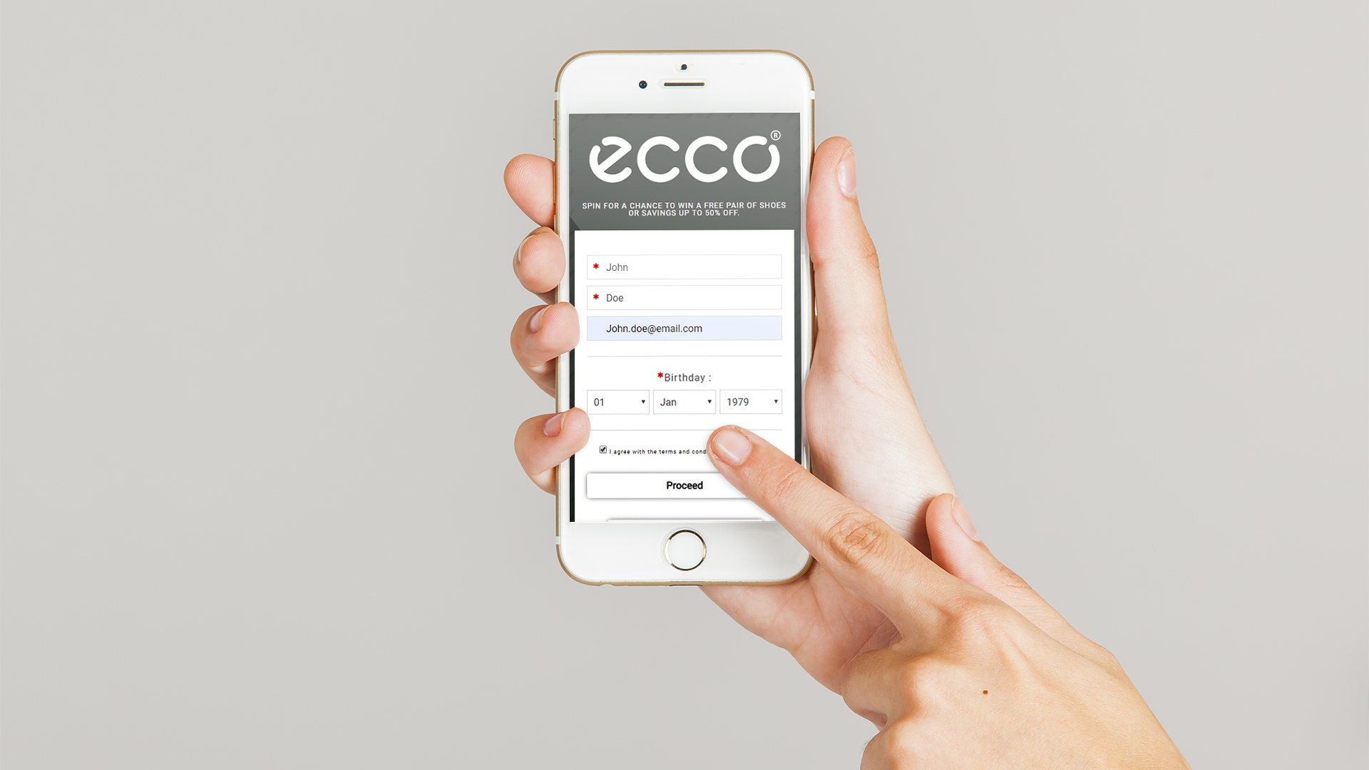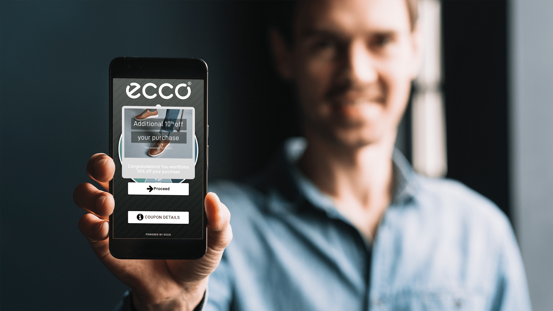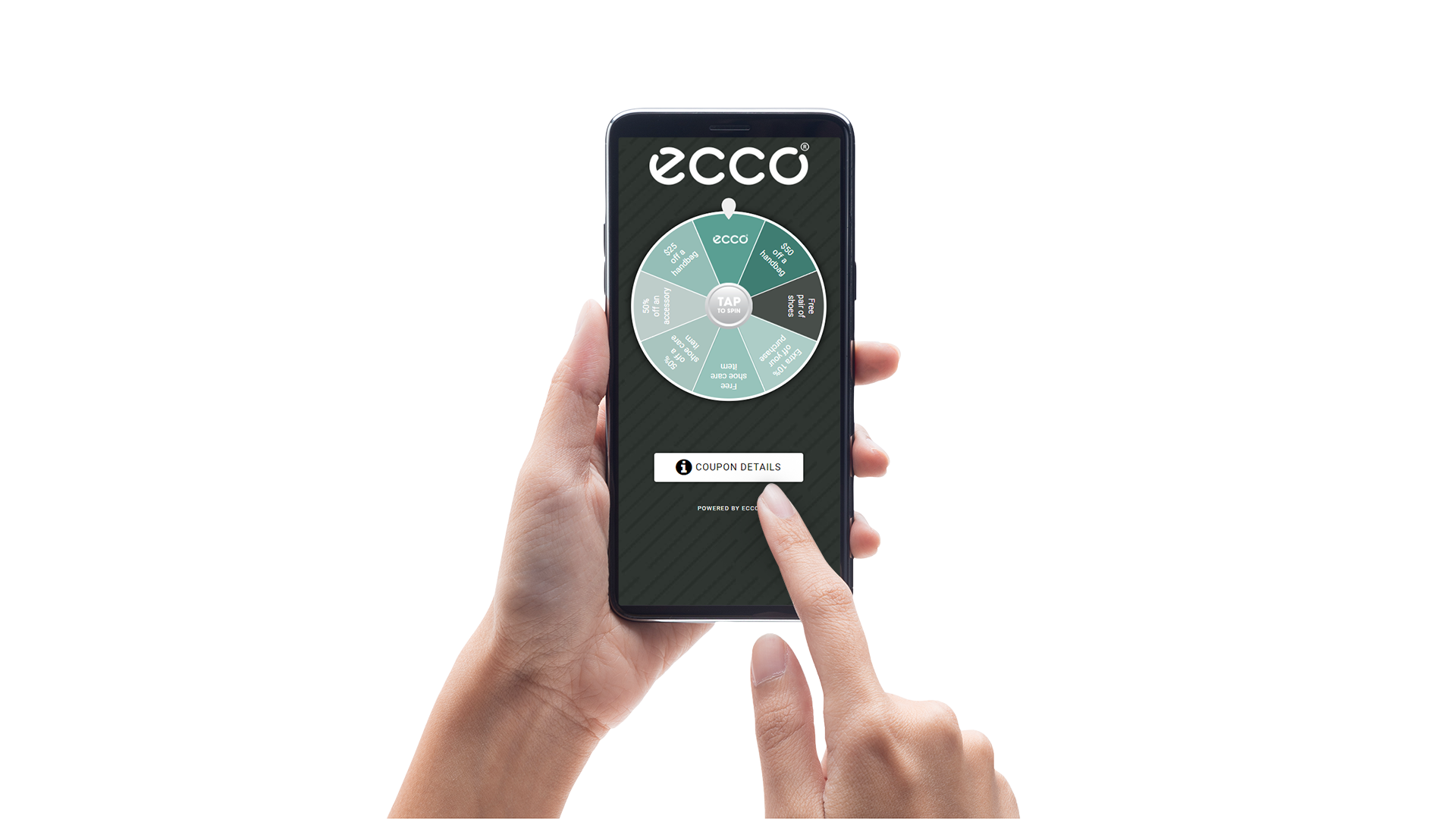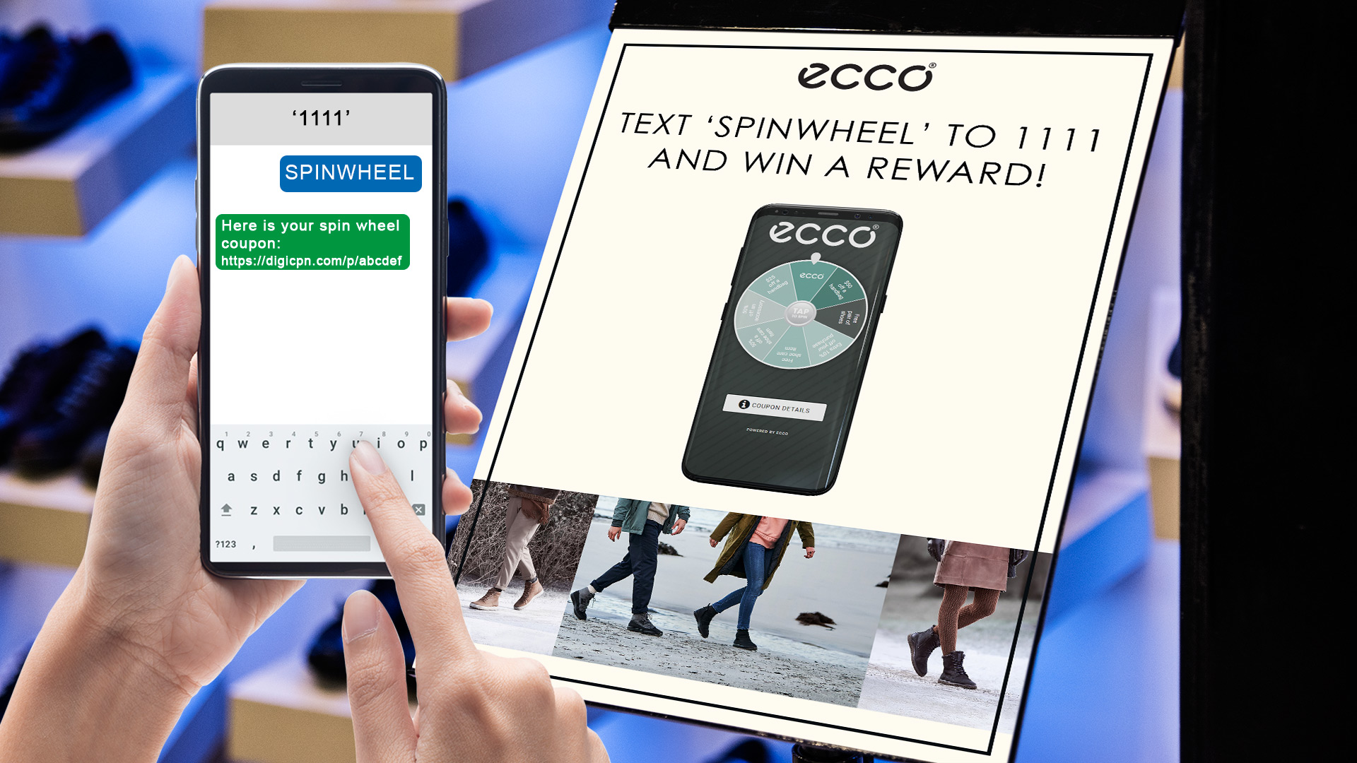 Ecco promocionó su campaña en la tienda usando carteles. Simplemente mencionó: Envía el texto "Spin Ecco" al [CÓDIGO CORTO], por ejemplo (1111). La audiencia que siguiera precisamente estos pasos recibiría una respuesta en su mensaje con el URL del cupón integrado en el mensaje de texto. Si el destinatario visitaba entonces la URL integrada, el cupón de la rueda giratoria aparecía en su navegador. Si el juego se jugaba correctamente, el usuario podía ganar descuentos en las próximas compras o un par de zapatos gratis. La cantidad de veces que se podía ganar un par de zapatos estaba restringida al máximo, mientras que las probabilidades de ganar descuentos eran flexibles.