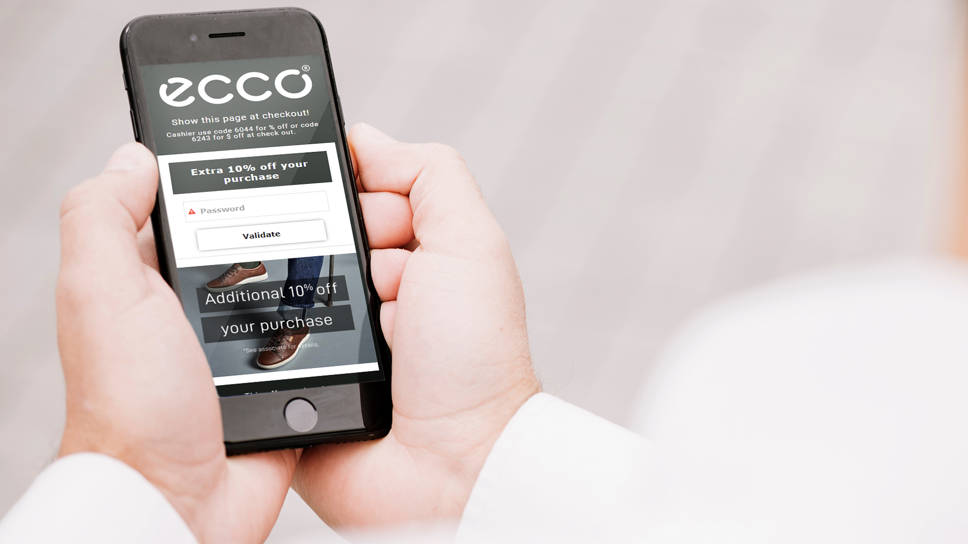 Para una validación segura, Ecco estableció contraseñas de validación únicas para cada lugar de canje. Los cajeros de cada tienda tuvieron que introducir la contraseña de localización única asignada a su tienda, en el dispositivo móvil del usuario. Si el cupón no se había usado antes y la contraseña era correcta, el cupón sería validado con éxito. Este enfoque, de utilizar contraseñas únicas para cada ubicación de canje, hacía posible que Ecco rastreara qué tienda era la más exitosa y reuniera la mayor cantidad de conversiones.