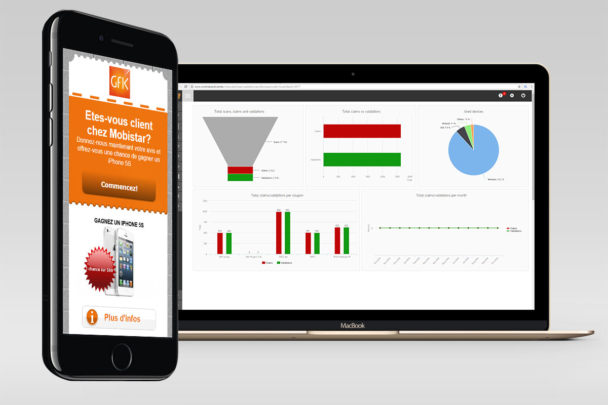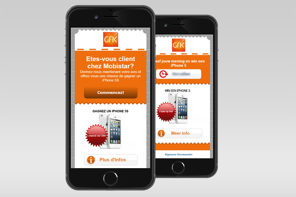 GFK est une grande organisation d’études de marché qui mène des enquêtes pour ses clients. Il était difficile pour GFK d’encourager les membres de la génération Y à participer à ces enquêtes. Avec un coupon mobile fabriqué sur mesure par Coupontools, GFK disposait de l’outil parfait pour collecter des informations sur ces données démographiques pour leurs clients. Le sondage de GFK a été chargé dans notre coupon comme méthode de réclamation pour un grand prix. Un participant sur 500 pourrait gagner un Iphone 5S. Seuls les participants ayant répondu à l'enquête ont pu participer au concours et nous avons également ajouté une connexion sociale. De cette manière, l’enquête a eu un taux de réponse élevé et elle a également généré des mégadonnées auprès de son public cible.