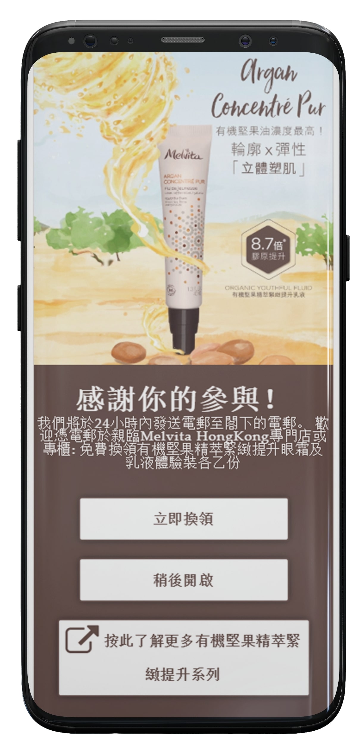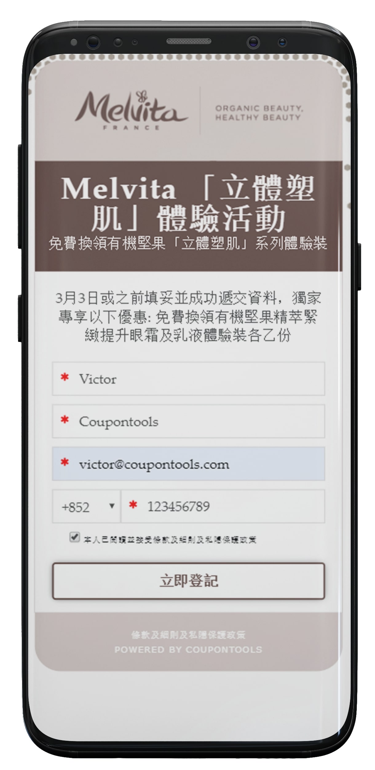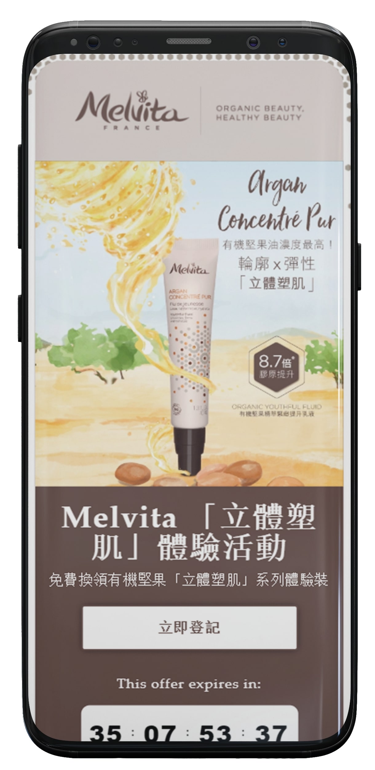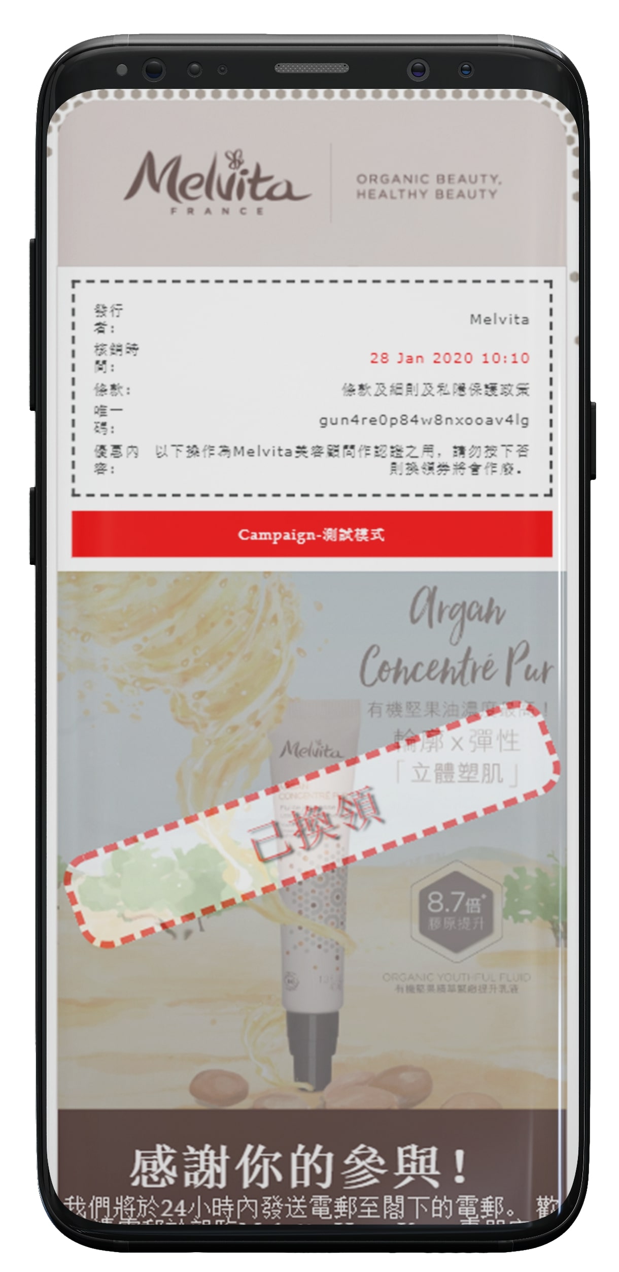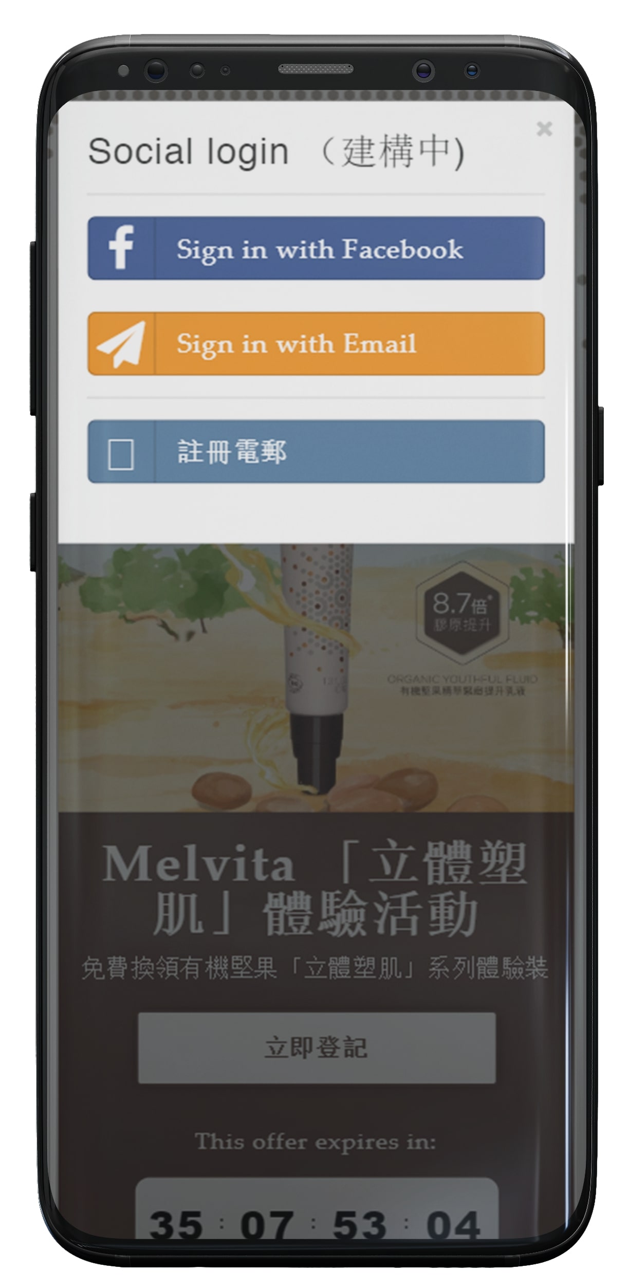 Voor de distributie van de coupon koos Melvita Hongkong voor Facebook. Ze hebben 285k page likes, wat resulteerde in een sterk, natuurlijk bereik voor de campagne. Klanten die op de coupon stuitte, moesten zich registreren om de korting te ontgrendelen. MelvitaHK maakte gebruik van de social login optie (Facebook of mail) wat de gebruikersregistratie vereenvoudigde. Gebruikers konden zich ook op de traditionele manier registreren, door hun persoonlijke gegevens in te voeren. Bij succesvolle registratie kreeg de klant toegang tot de kortingsbon.