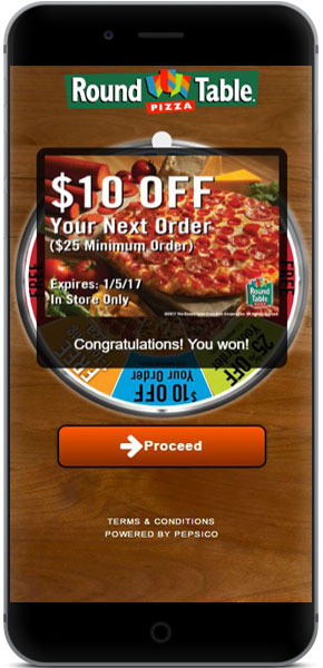 PepsiCo a stimulé les ventes de Round Table Pizza grâce aux coupons ludifiés. PepsiCo a récemment distribué des coupons mobiles à des milléniaux situés à proximité de commerçants participants, comme Round Table Pizza, un établissement de restauration rapide, qui les a invité à faire tourner une roue électronique pour gagner une réduction.