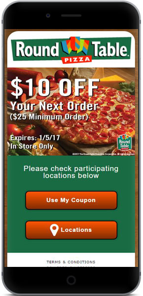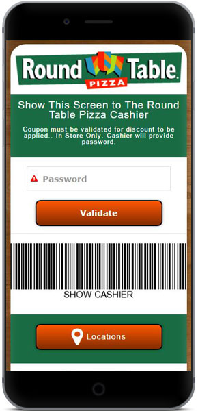 5) Le consommateur peut échanger le coupon en boutique et Round Table Pizza peut valider le coupon à l’aide de nos méthodes de validation faciles d’utilisation.