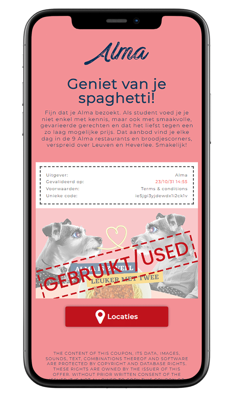 - Wachtwoordvalidatie: Om de kortingsbon te verzilveren, moesten de studenten een wachtwoord opgeven. Het wachtwoord was locatiegebonden, wat ervoor zorgde dat Alma wist welke locatie het meest bezocht werd met de coupon.